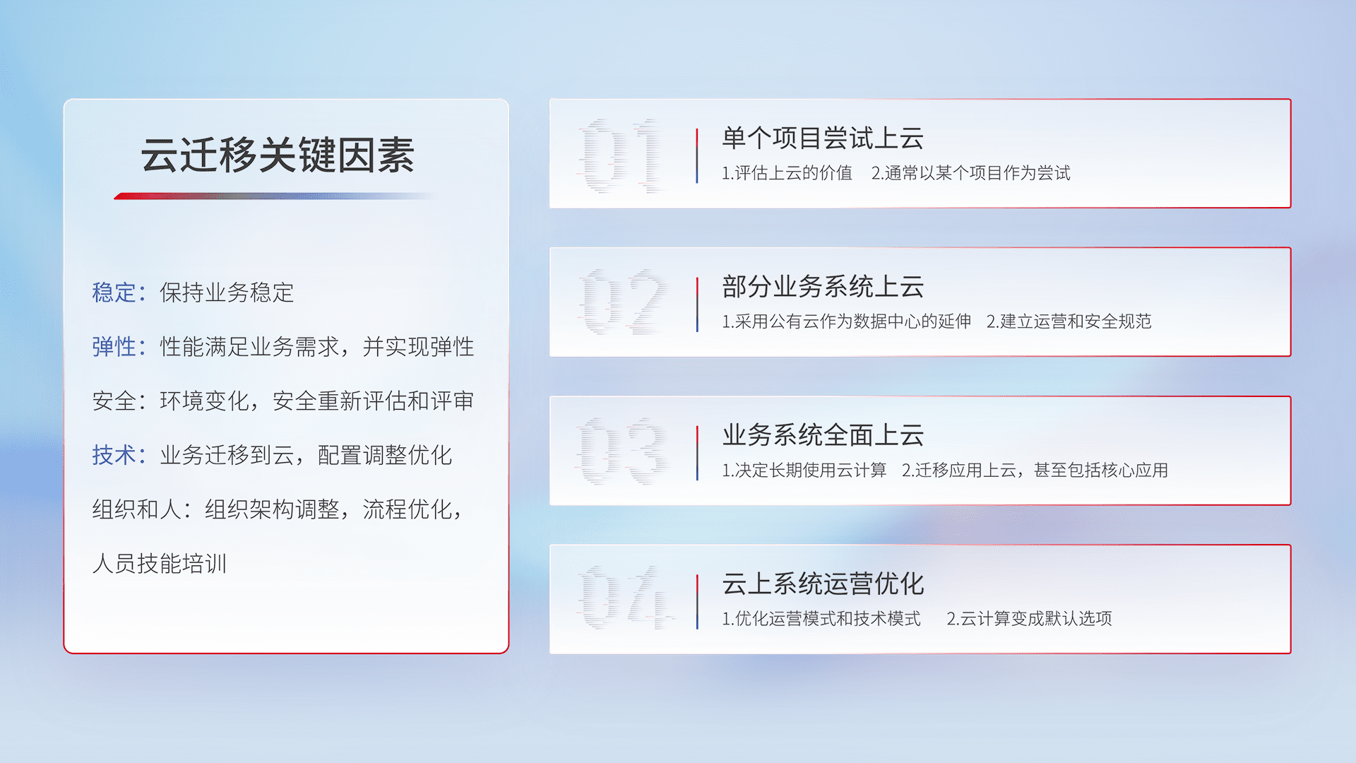 结合实际业务,,从规划设计、、、云平台选型、、、、云原生改造、、、数据迁移、、集成交付,,迁移全过程为客户识别最佳上云路径,,做好风险识别管理,,设计网络架构、、、、身份权限、、、、安全审计合规、、操作审计、、、日志审计、、监控告警策略、、多站点容灾设计等,,,对云上基础设施进行整体规划,,提升IT治理水平,,,,以满足弹性、、高可用、、高性能的需求。。